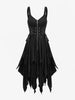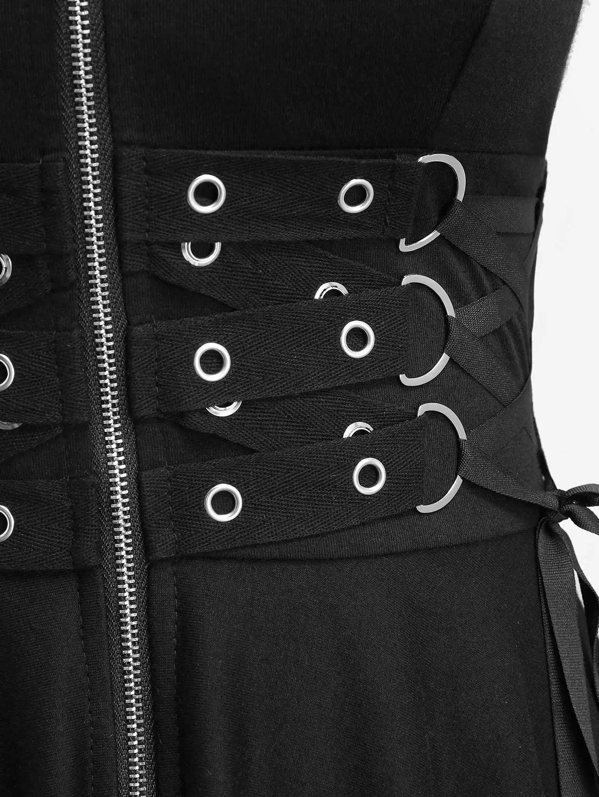 Darkness dressed with intention. The jagged handkerchief hem tears downward in uneven points, while a grommet-studded waist band cinches the silhouette into something quietly commanding. A silver pentagram zipper pull sits at the chest — subtle enough to mean something, visible enough to be seen.