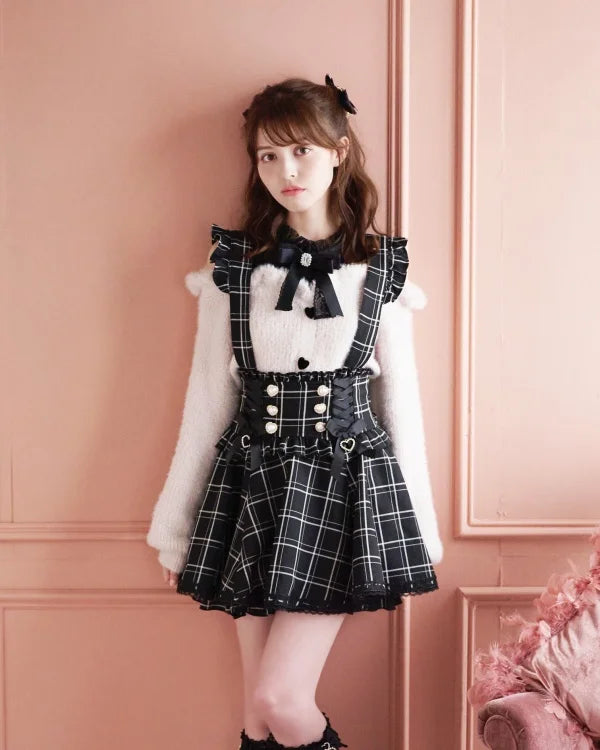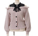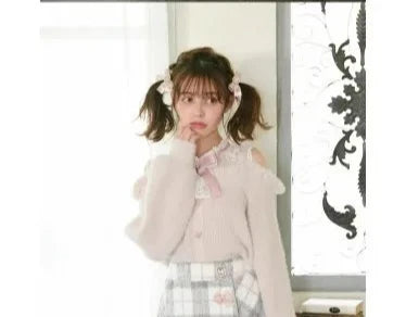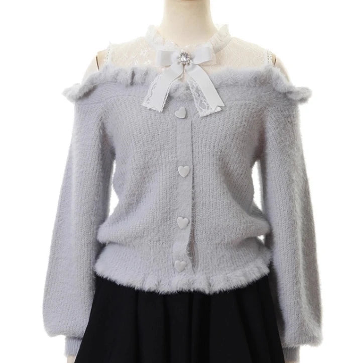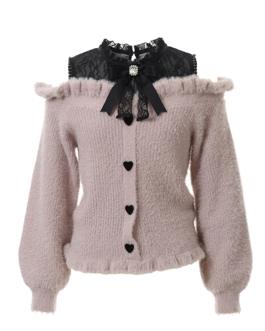 Soft as a secret, sharp as a heartbreak. This blush-pink cardigan walks the razor's edge between saccharine and sinister — fluffy mohair-like texture melting into black lace panels and velvet heart buttons that feel like a love letter written in disappearing ink.