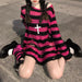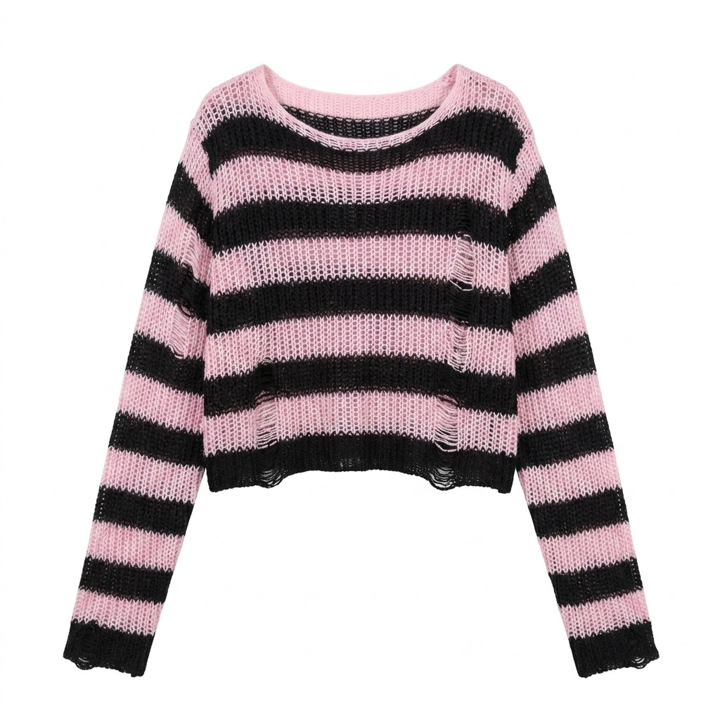 Pink and black stripes unravel into something darker — an open-knit construction that sits between sweetness and decay. Oversized and slightly sheer, it layers over mesh and lace like it was always meant to haunt a bedroom at dusk.