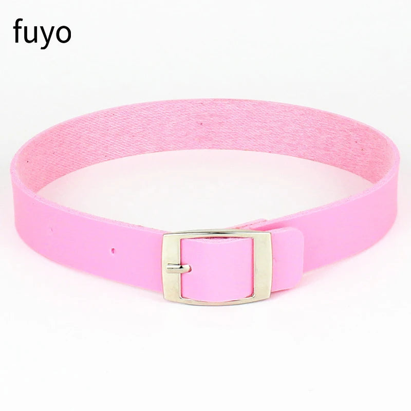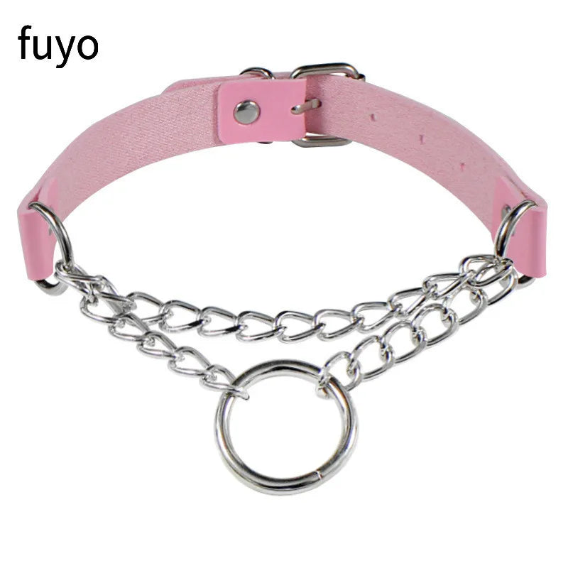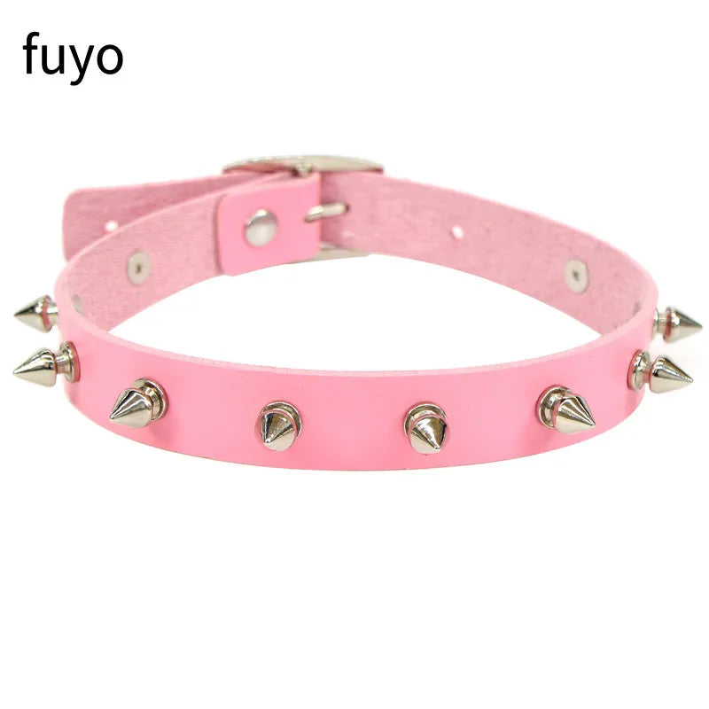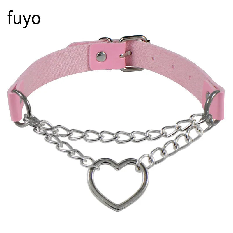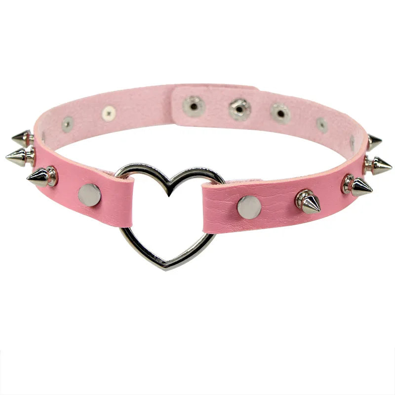 Sweet on the surface, sharp underneath. These bubblegum-pink chokers walk the line between sugar and spikes — heart locks, O-rings, chains, and rivets layered over candy-soft leather. Wear one or stack them; either way, the contradiction is the point.