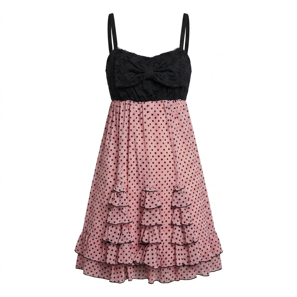 Sweet on the surface, something darker underneath. A black lace-trimmed bow bust meets a blush pink polka dot skirt — all tiered ruffles and quiet contradiction, like a music box left open in a haunted room.