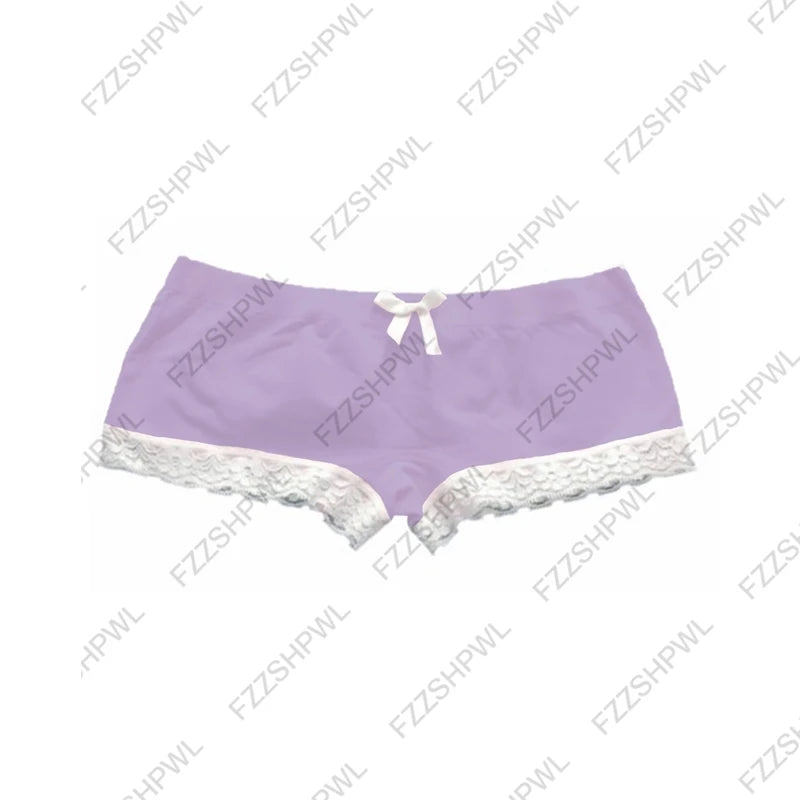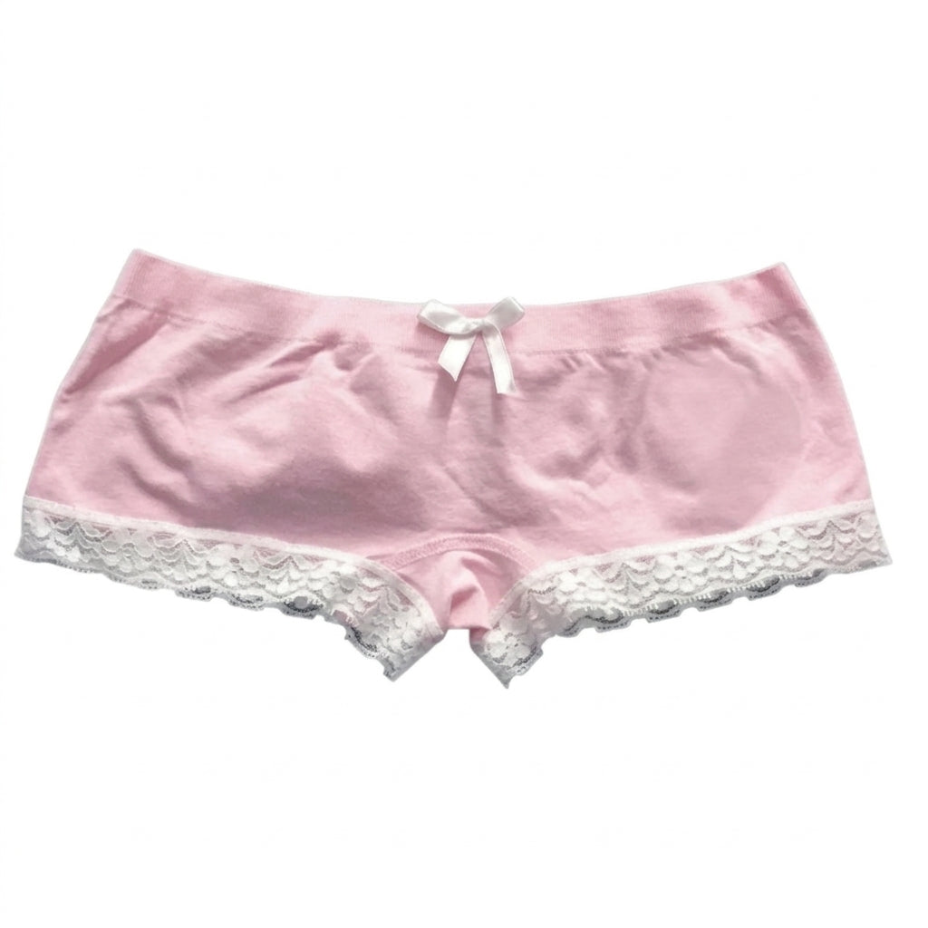Soft as a daydream, sharp as a secret. These blush-pink boy shorts walk the line between innocence and intent — a tiny satin bow at the waist, white lace scalloping the hem like the edge of something forgotten.