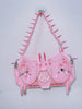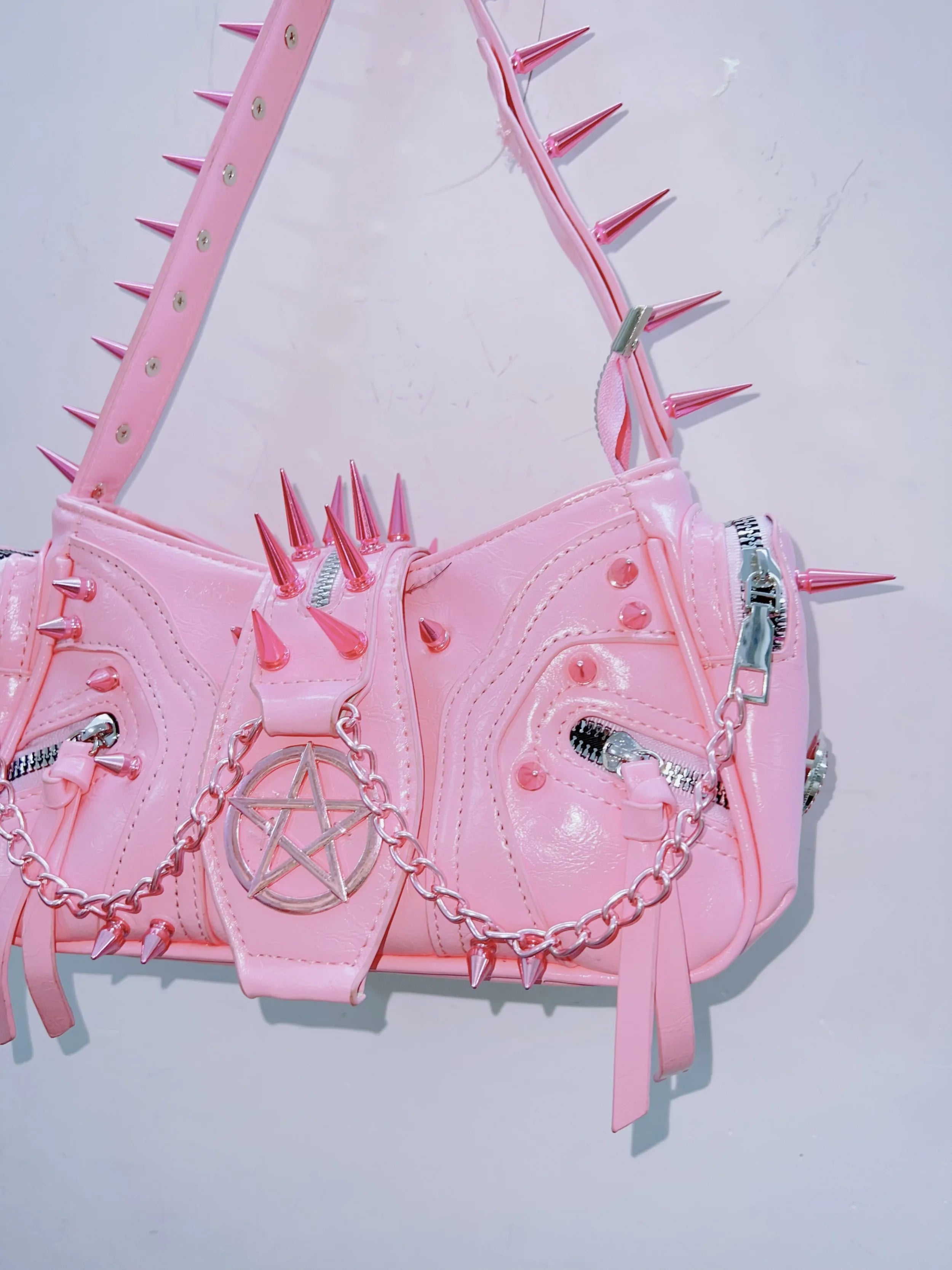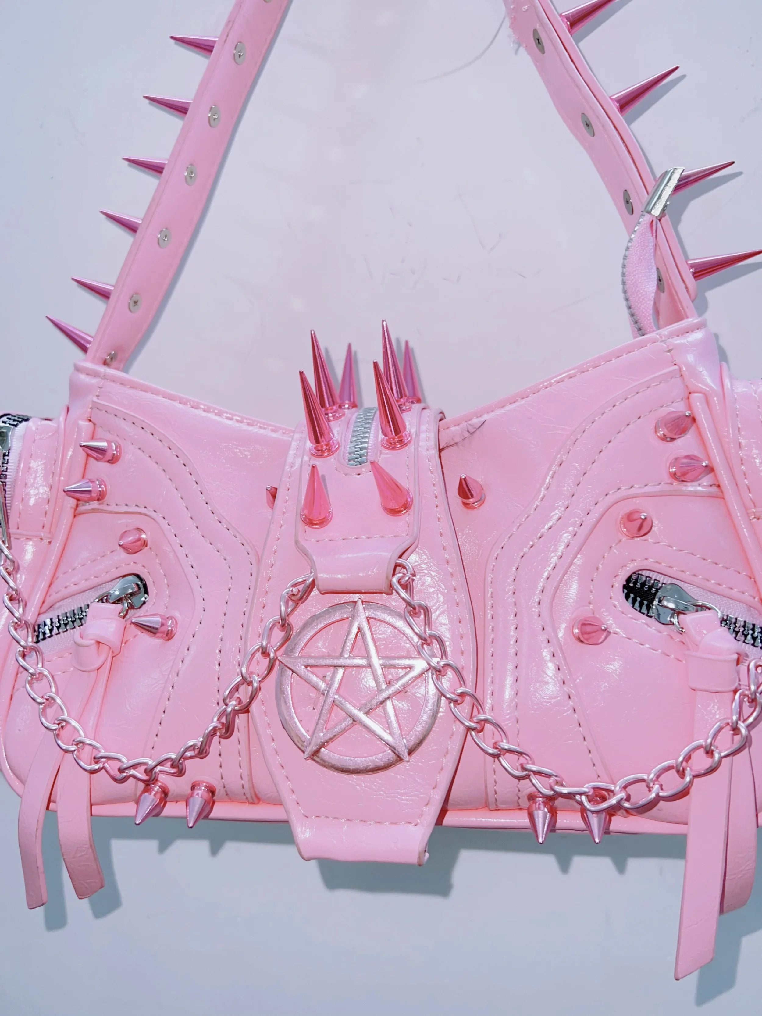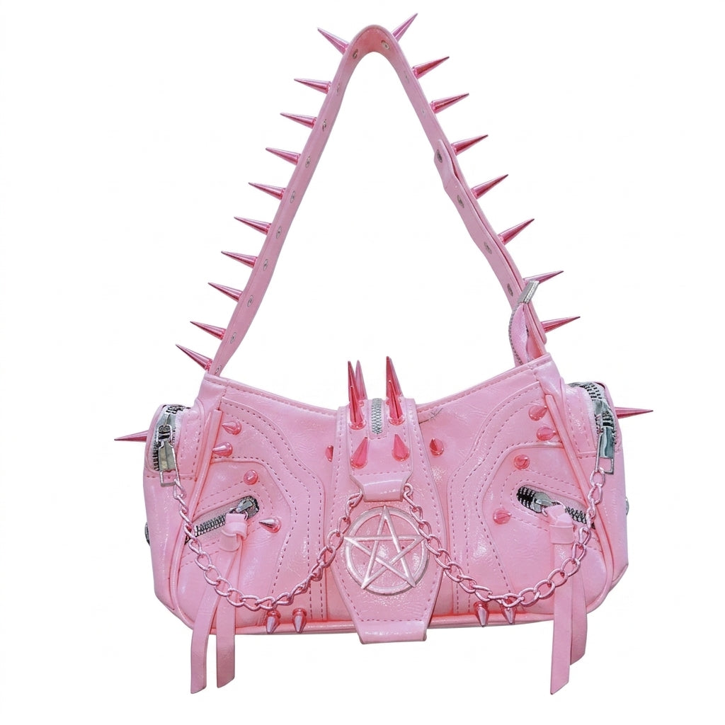Sugar-coated and serrated. This bubblegum-pink baguette carries the energy of a cursed offering — all gleaming patent leather, silver pentagrams, and spikes that warn you before you get too close. Sweetness with a bite.