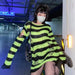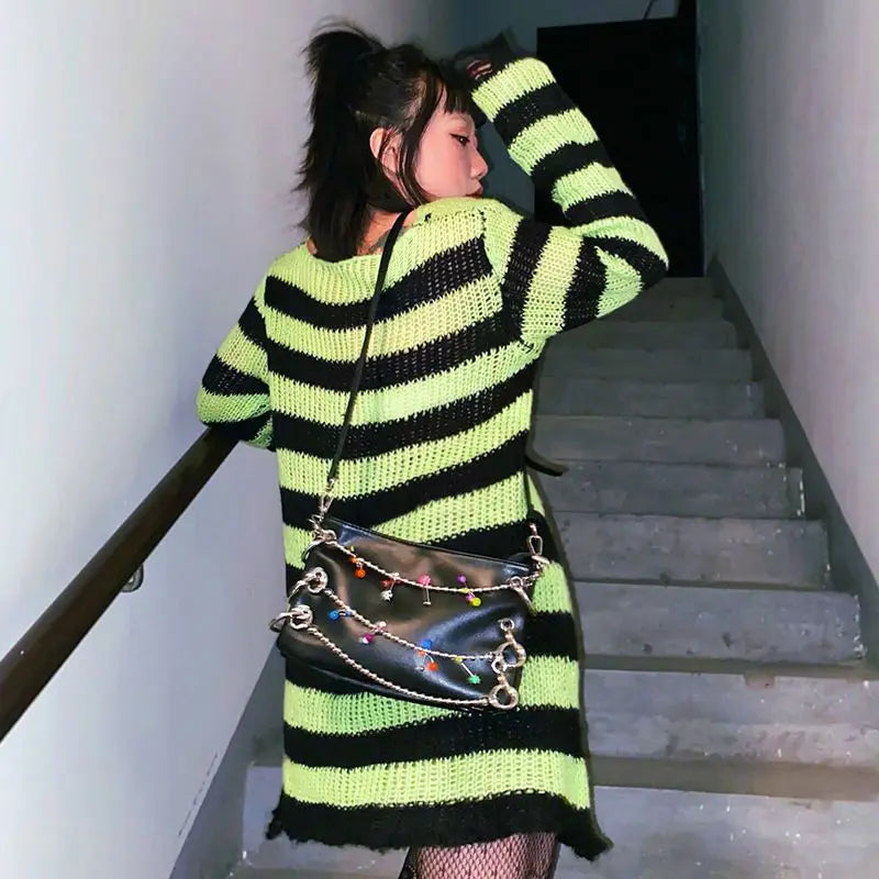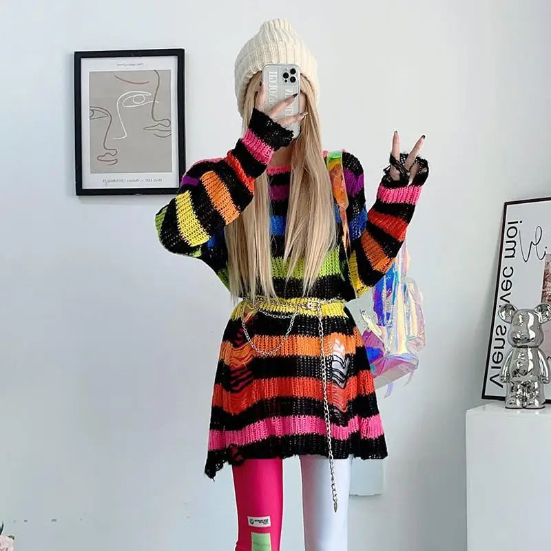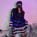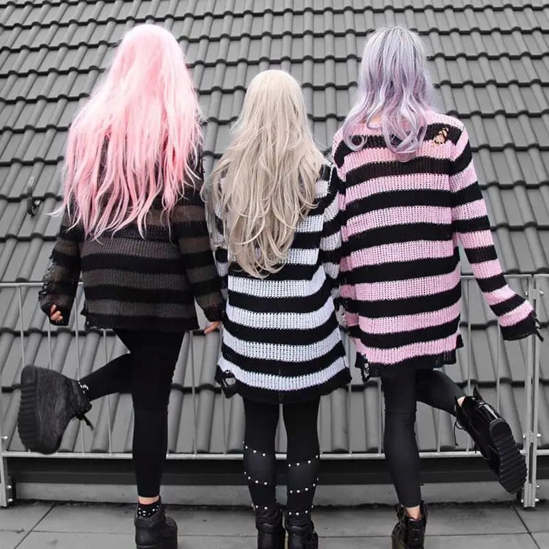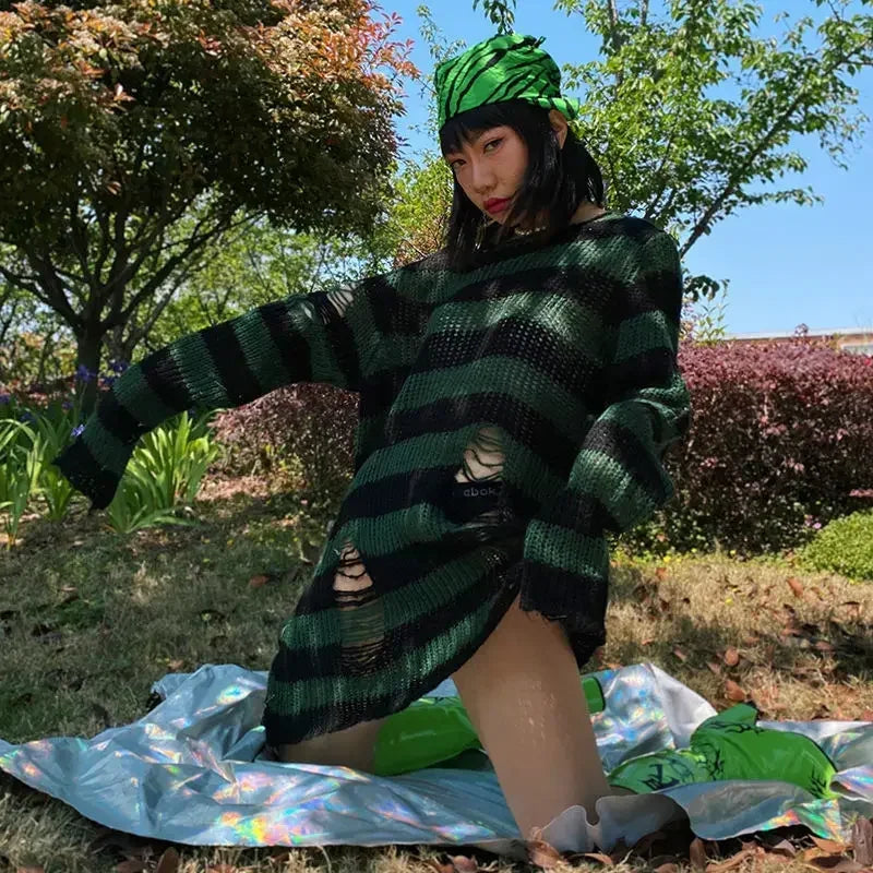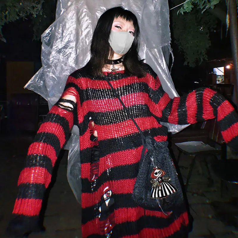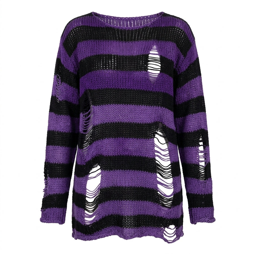 Somewhere between a haunted carousel and a bruised sky — this oversized striped knit unravels exactly where it should. Shredded hems and scattered rips give it that lived-in, fallen-apart energy that no scissors could fake. Wear it long, wear it layered, wear it like you've had a very interesting year.